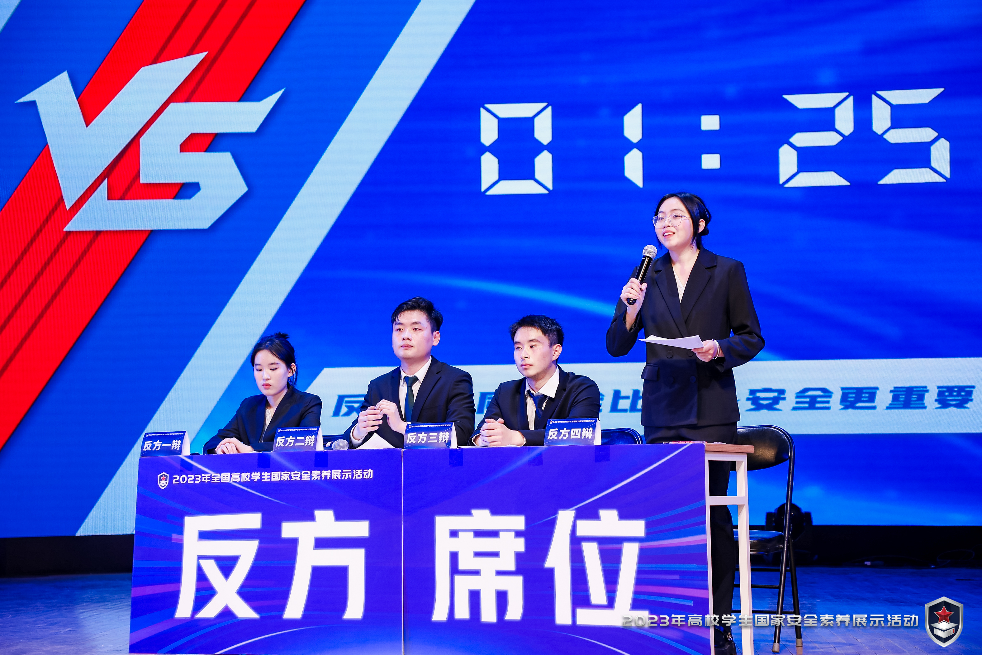 4月13日是决赛日。晋级的8支队伍同样通过三轮环节进行展示,总分前两名队伍进入”终极PK“辩论赛。与半决赛相比,决赛题目更灵活、赛场气氛更热烈,充满未知与挑战。在激烈的竞争中,我院四名队员在前两个环节均获满分,第三环节“安全公开课”是拉开分数差距的关键一环,代表队以“藏在宇宙中的危机”为题,通过短剧表演展示了对“太空安全”的理解。队员们生动的表现力收获了台下观众的积极反响和评委老师们打出的93.6分的好成绩。