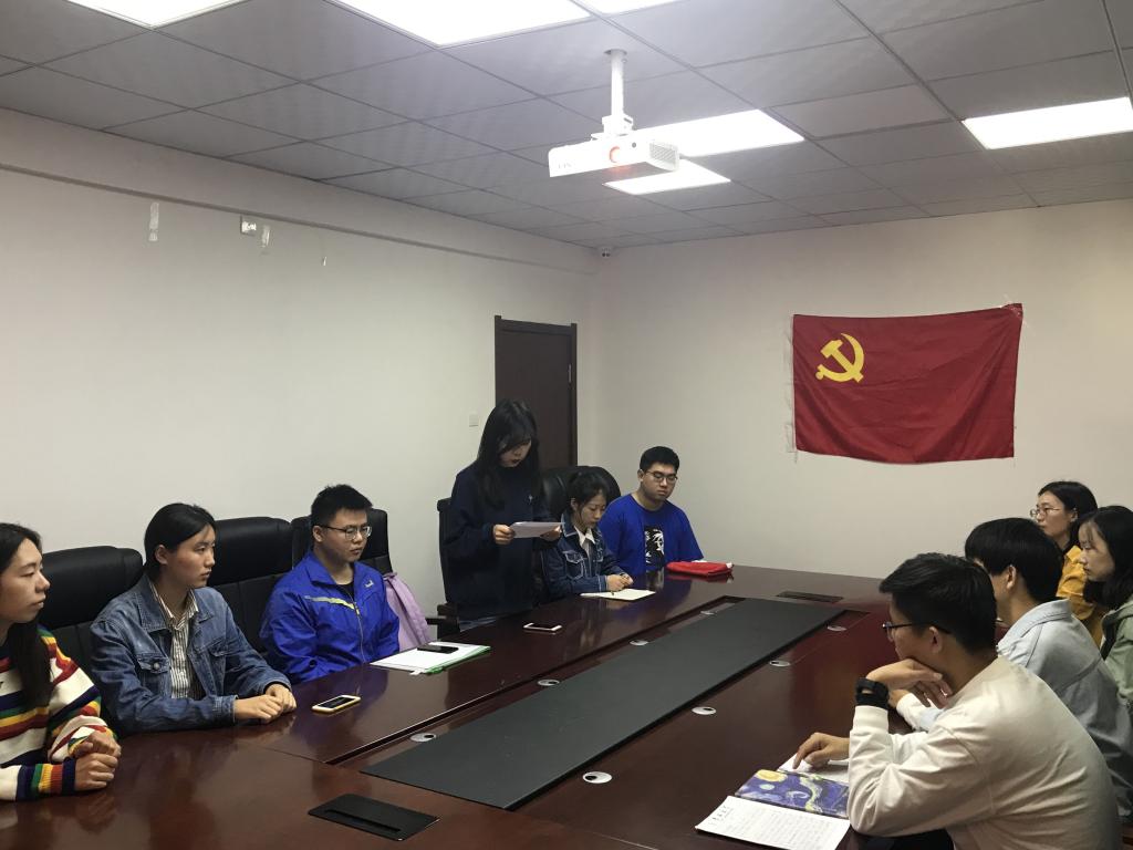 主持人宣布会议开始后,全体起立奏唱《国际歌》。随后,主持人宣读新党员名单。在庄严的气氛下,全体起立,4位新党员在党员代表刘妍汝的带领下,面向党旗进行入党宣誓。他们用洪亮的声音、饱满的热情,抒发了对加入中国共产党的自豪与决心。