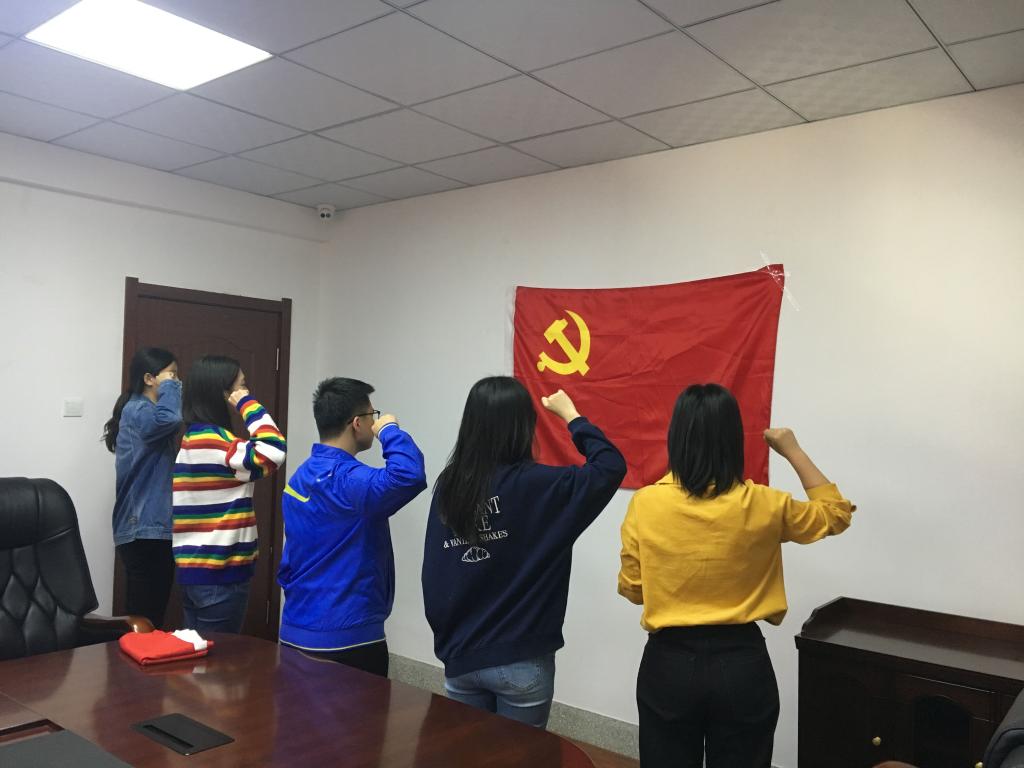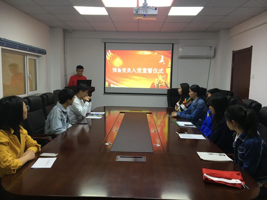 学生党支部在行政楼二楼小会议室举行了新党员入党宣誓仪式。正式党员代表孔祥琦、刘妍汝,预备党员黄丁瑶、樊鸿刚、王川、张曼娜以及部分入党积极分子代表参加了此次宣誓仪式。会议由本科生党小组负责人孔祥琦主持。
