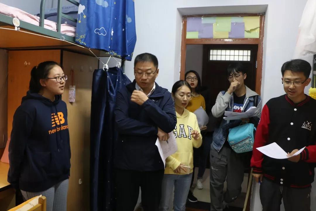 学院党总支书记杨民、2019级新生辅导员王力老师等人携团委学生会部分成员组成评委团,前往南苑九公寓、文苑一公寓对学生内务整理情况、寝室整洁情况、门窗卫生情况等一一进行了检查与评分。
