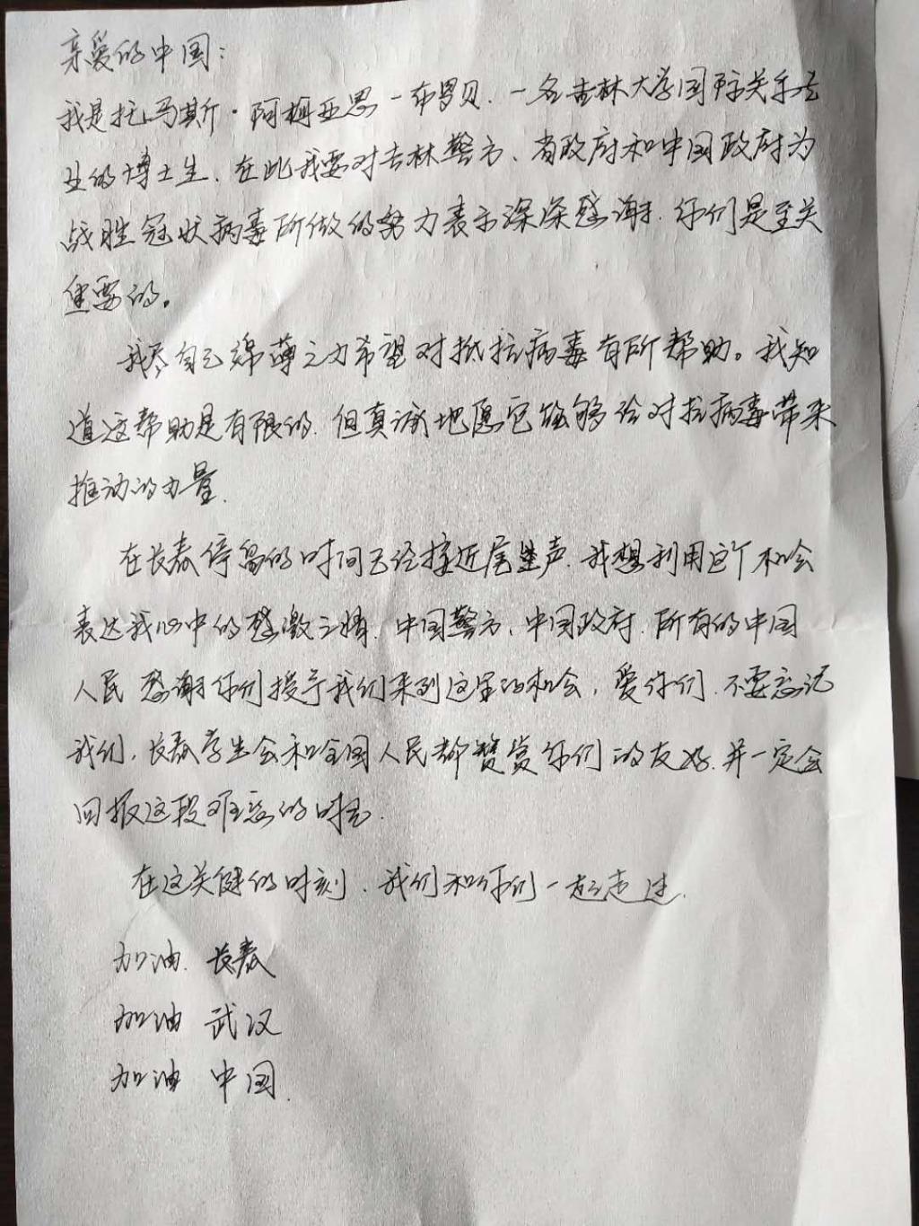 愉快的交谈过后,托马斯掏出了他用中文书写的感谢信。他在信中感谢中国政府、吉林省政府和警方为战胜冠状病毒所做的努力,并深情地写到,“在长春停留的时间接近尾声,希望尽自己的绵薄之力对抵抗病毒有所帮助,感谢中国政府、警方和所有的中国人民给我们机会来到这里,请不要忘记我们,在这艰难的时刻,我们和中国人民在一起。加油,中国!加油,武汉!加油,长春!相信在大家的共同努力下,一定能打赢这场没有硝烟的战争。”随后,前进大街派出所联系学校保卫处和学院,将托马斯的优秀事迹通报给学校,向成人论坛