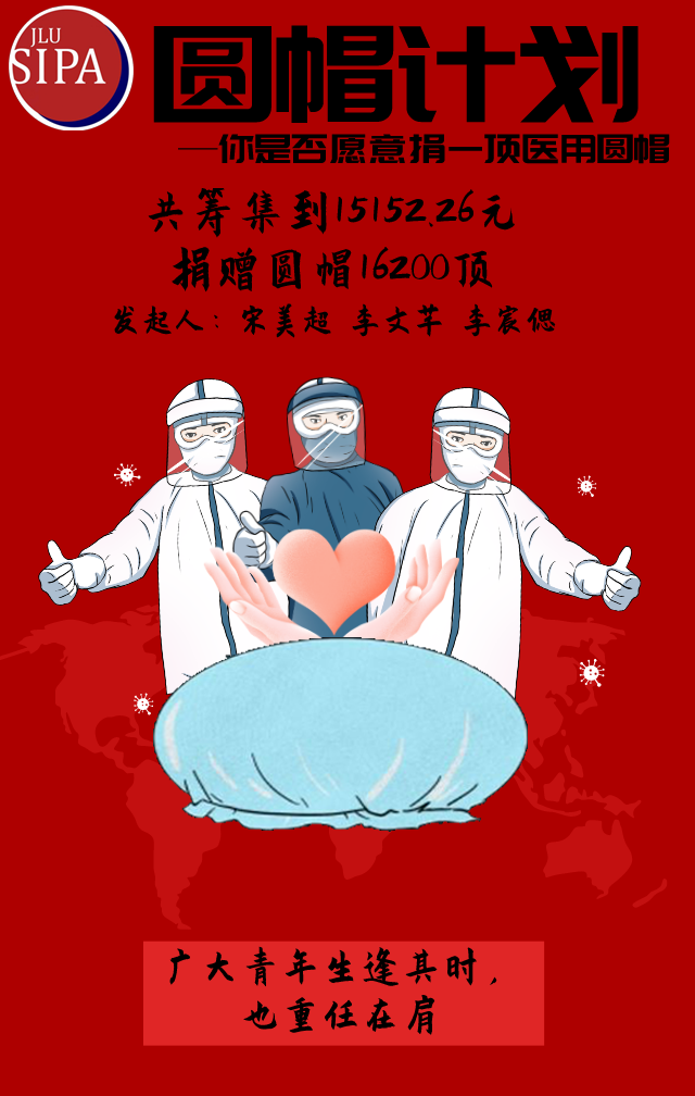 2020年初,众多一线医院与新型冠状病毒展开斗争,许多医护人员写下请战书,全国人民上下一心驰援武汉,各种募捐渠道都得到了广泛响应,真正让人体会到什么是“一方有难,八方支援”。然而,在紧张的抗疫之战中,湖北省一些医院物资不足,甚至出现五六位医护人员共用一套防护服的情况。在观察到这种状况之后,2018级1班团支部两位优秀青年宋美超和李文芊决定组织参与“医用圆帽捐赠计划”,自1月26日发起,结合当地疫情和医院需求,计划为湖北省黄冈市中心医院、孝感市第一人民医院、南漳县中医医院和咸宁市第一人民医院四家医院各捐赠5000个医用原帽。在社会各界的支持与努力下,此次计划最终为四家医院捐赠医用原帽共计16200顶。“圆帽计划”完美诠释了新时代青年生逢其时且重任在肩,在祖国最需要的时刻贡献青春力量的优良品质。我支部将此事件作为优秀的抗疫案例进行宣传,希望激励更多的青年踊跃投身于建设祖国的伟大工程之中,不畏艰险抗击疫情。