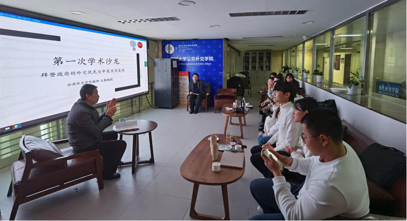 本期SIPA师生沙龙邀请到了我院王黎教授以“拜登政府的外交优先与中美关系走向”为题与同学们进行交流探讨。学院党总支书记杨民老师、院团委书记张淑艳老师以及部分教师和学生参与了此次师生沙龙活动。