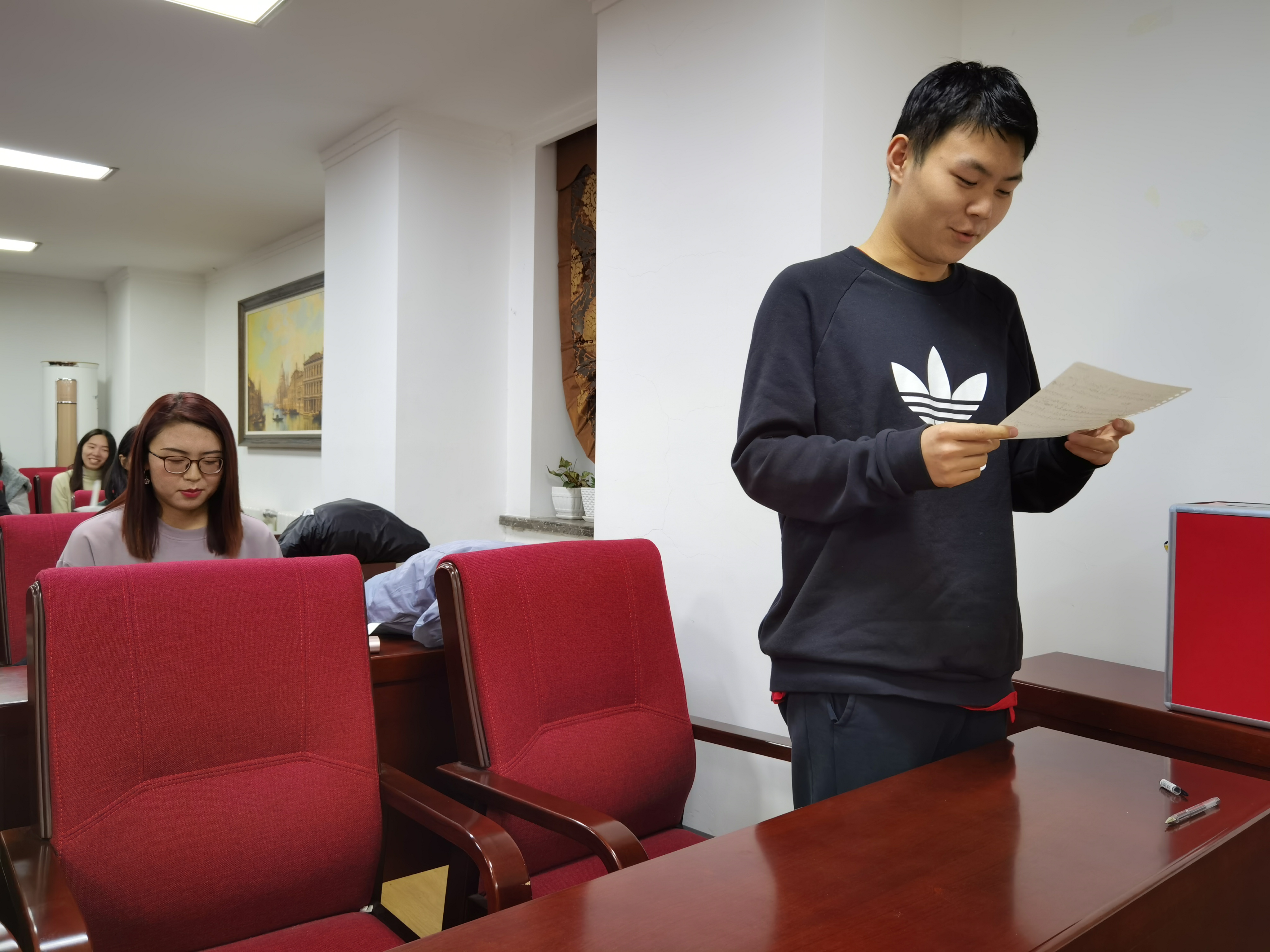 此次宣誓仪式由学生党支部书记张淑艳老师主持。按照仪式议程,到会的全体党员与入党积极分子代表首先合唱了《国际歌》。同志们的歌声雄壮有力,为现场渲染出庄严的气氛。在学生党支部纪检委员宁煊同学的带领下,学生党支部2020上半年新发展的两名预备党员田慧同学和李淑琴同学面向党旗庄严宣誓。到会的其他正式党员也参与重温了入党誓词。现场响起阵阵激昂的宣誓声,参与宣誓的每一名党员同志都用发自内心的声音抒发着对党忠诚的决心。面对党旗,大家接受了一次身心的特殊洗礼。随后,李淑琴同学作为预备党员代表发言。她表示,感谢党组织对她的培养,她一定不会辜负党组织的信任,请党组织在实践中考验她。张博宇同学作为入党积极分子发言,他诚恳朴素地表达了自己积极向党组织靠拢的决心。