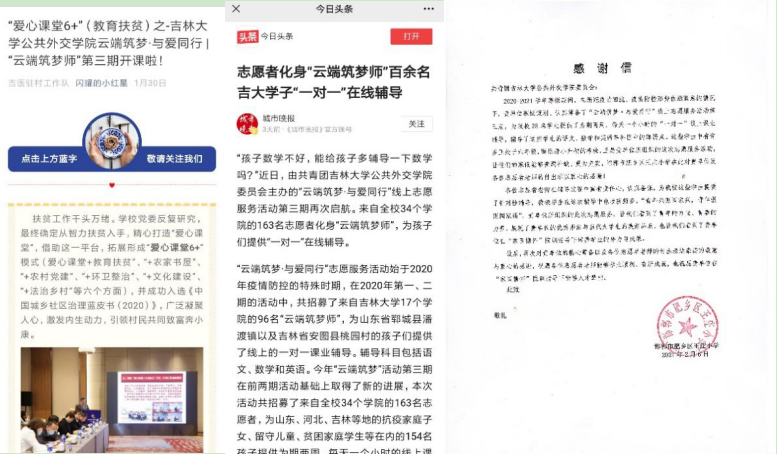 团委发来了感谢信,感谢主办方与志愿者们的辛勤付出。吉林省安图县桃园村小学发布了专题推送,城市晚报和今日头条也对该期活动进行了专题报道。