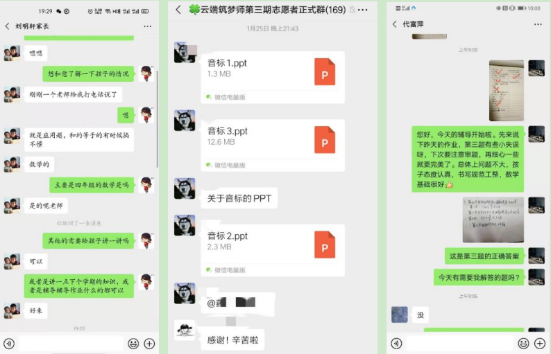 在辅导阶段,志愿者们积极联系家长,了解孩子们的学科薄弱点,力求为孩子们提供针对性的辅导。辅导依托钉钉、腾讯会议等线上平台进行,辅导科目包括语文、数学和英语。线上支教期间,志愿者们在群里积极沟通,分享教学资料与教学方法,沟通辅导心得。两周的时间内,上传在群里的难以估量的资料与教学凭证见证了各位志愿者们的责任、爱与付出。