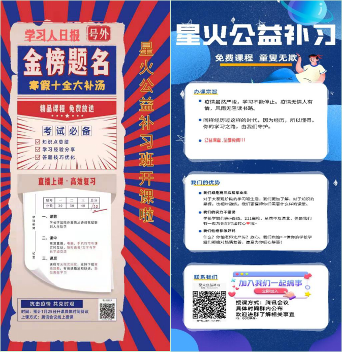 接下来让我们走近“星火公益补习小队”——为给学业受到疫情影响的高中学子们提供帮助,我院20级本科生王俊翔和陈信亚在线上组织开展了一次面向高中学子的公益补习活动。
