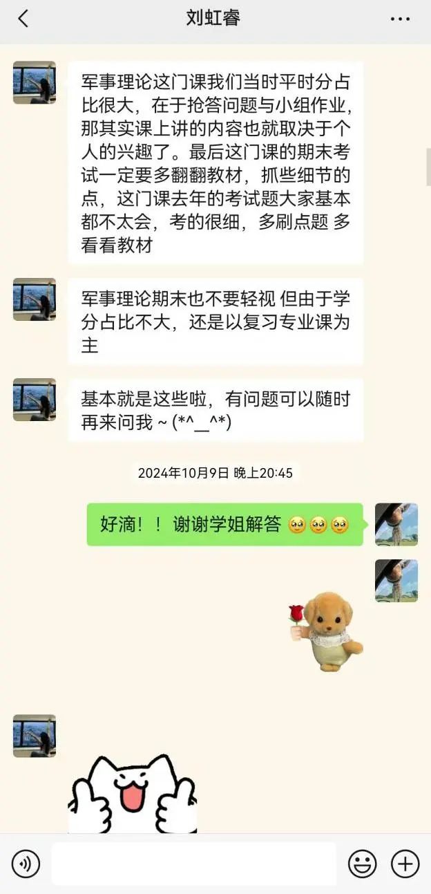 学姐非常认真细心地回答我的问题,从专业课到公选课,从学习到日常生活,为刚上大一有许多迷茫困惑的我解决了问题并指明了方向,我在学姐的帮助下也顺利的度过了大一上学期,感谢学伴活动让我有机会向学长学姐取经,谢谢学姐的帮助与鼓励。